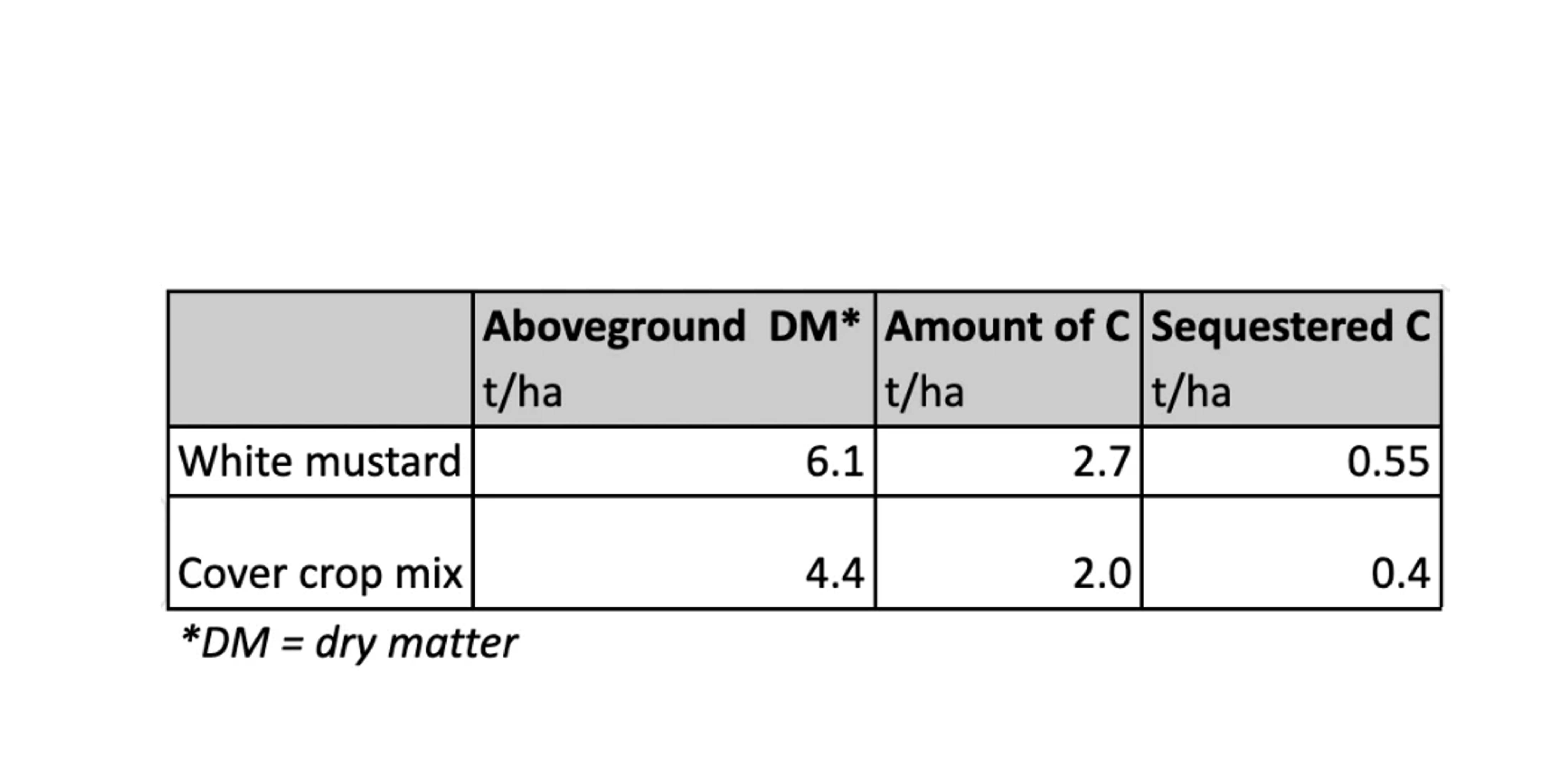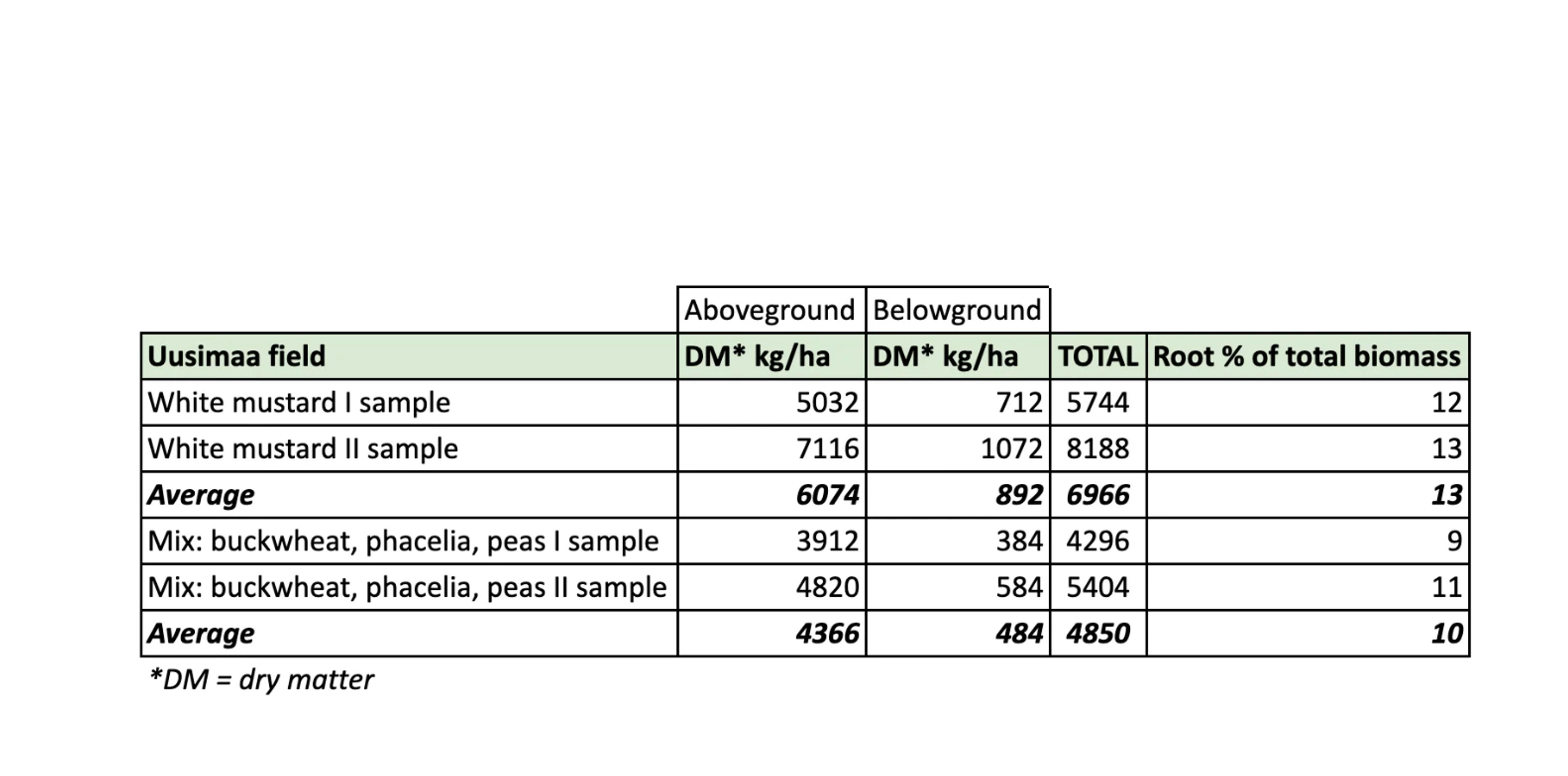 På hösten såddes vitsenap på 4 ha (10 kg/ha) och en blandning (ärtor, honungsört, bovete) på 12 ha (45 kg/ha). Sådd utfördes den 4 augusti med direktsåmaskinen Horsch Avatar. Den aktiva tillväxtperioden varade till slutet av oktober då temperaturen fortfarande var över +5 °C – en tillväxtperiod på cirka 2,5 månader. Forskare från The Centre of Estonian Rural Research and Knowledge samlade in biomassa ovan- och underjordiskt i slutet av oktober, som sedan torkades och vägdes.