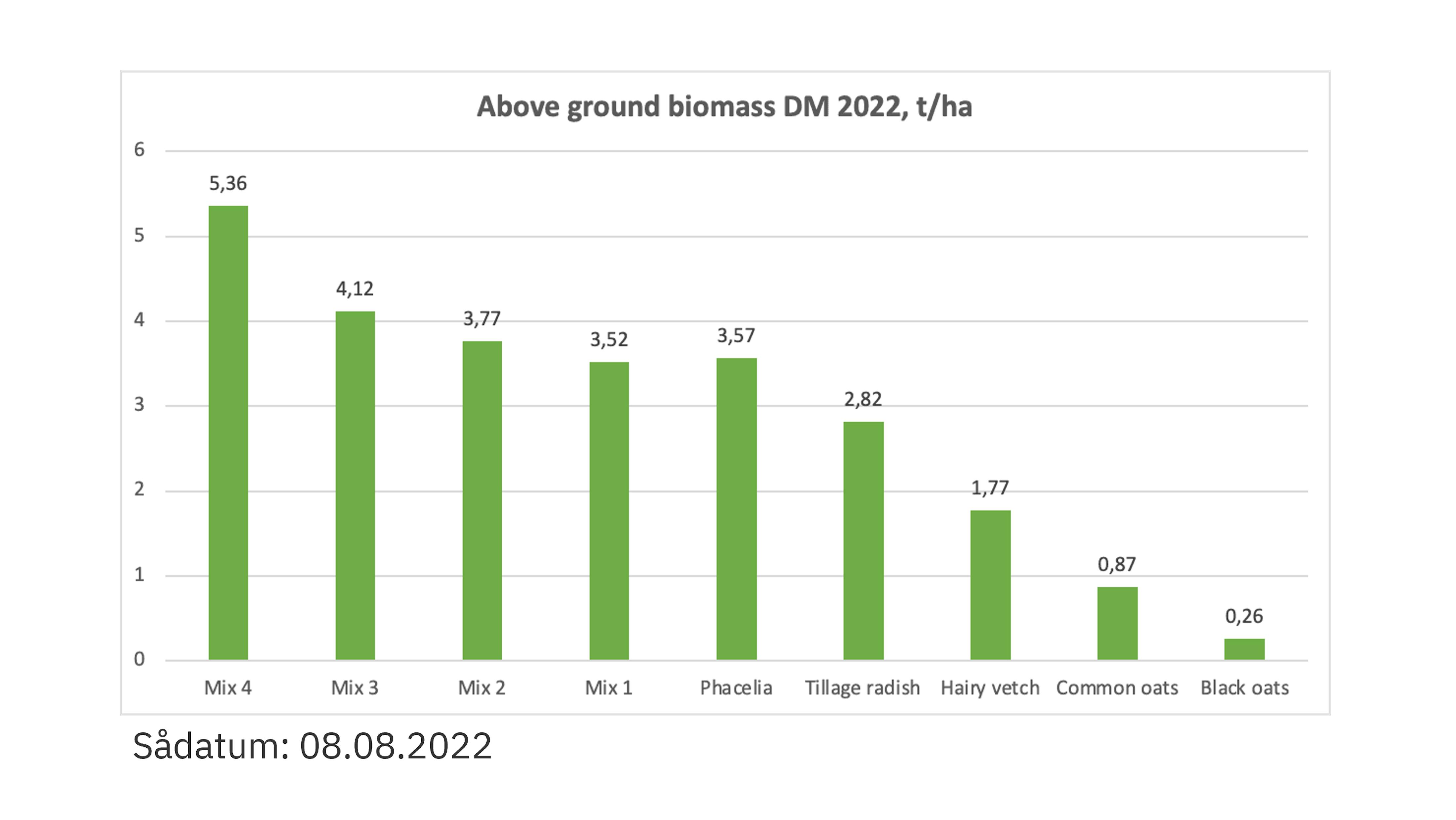 Resultaten ovan ska ses som exempel. Det är viktigt att alltid välja arter som är anpassade till den enskilda gårdens förutsättningar. Arterna i blandningen bör inte vara samma som används som huvudgröda i växtföljden, och det är klokt att undvika sådana som är känsliga för samma skadegörare eller sjukdomar.