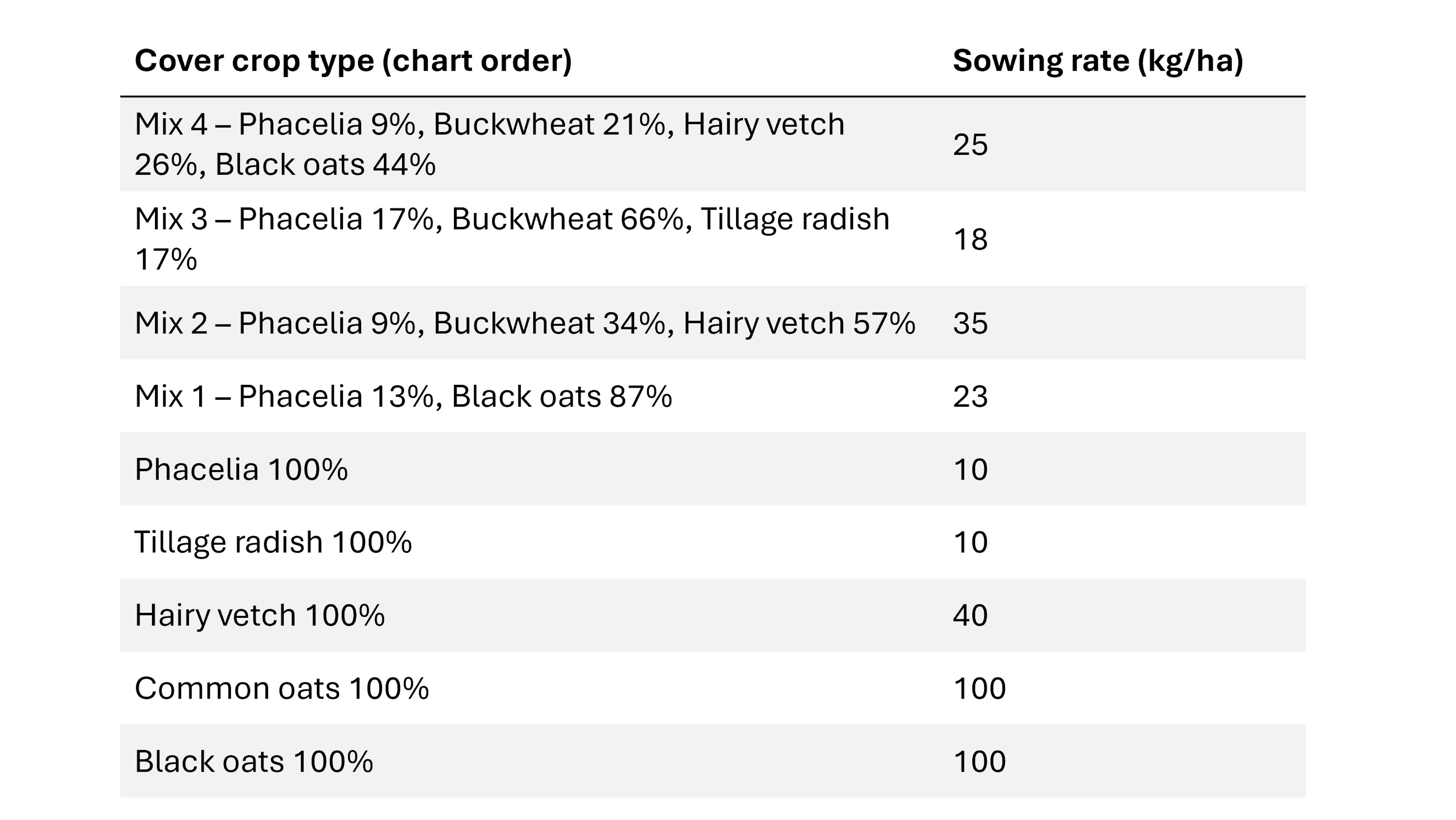 Valet mellan färdigblandade fröblandningar och egenkomponerade blandningar beror på flera ekonomiska faktorer. Oavsett vilket är det värt att notera att en betydande andel honungsört (phacelia) eller vicker i blandningen kan vara gynnsamt. Tyska studier visar att dessa två arter hjälper marken att behålla betydligt mer vatten jämfört med att lämna marken bar – något som är särskilt värdefullt under år med hög avdunstning. Honungsört minskar vattenförlusten från marken med 19,2 %, och vicker med 25,5 %. Se studierna av Gernot Bodner via praxis-agrar.de