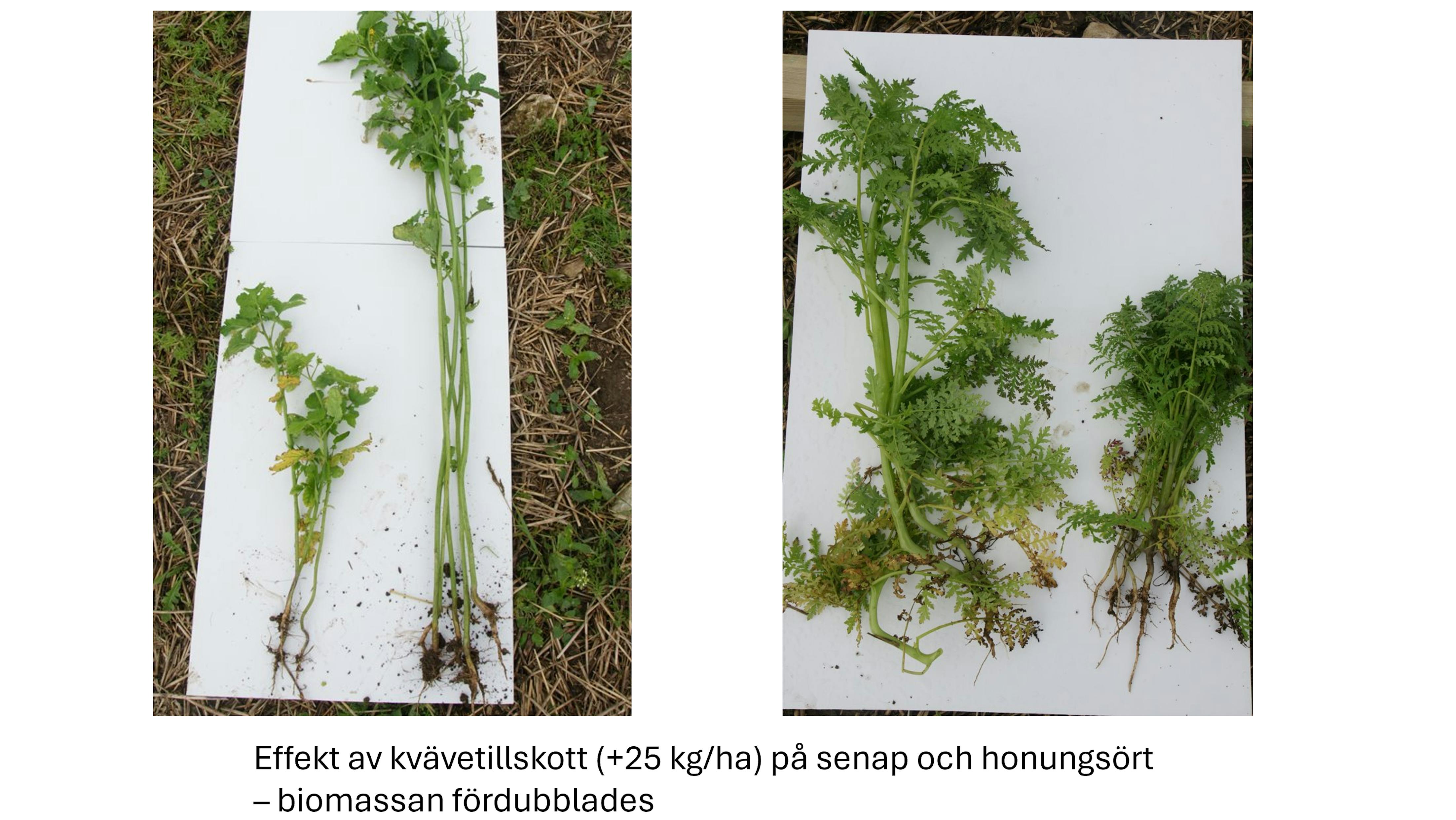 Kvävet ska här inte ses som en ren kostnad. En välutvecklad fång- eller mellangröda binder mer nitratkväve, det vill säga det restkväve som finns kvar i de djupare jordlagren efter skörd. Utan en växande gröda riskerar detta kväve att lakas ur under vintern och gå förlorat för nästa års gröda. Med en bättre etablerad gröda finns det istället kvar och blir tillgängligt för efterföljande gröda.